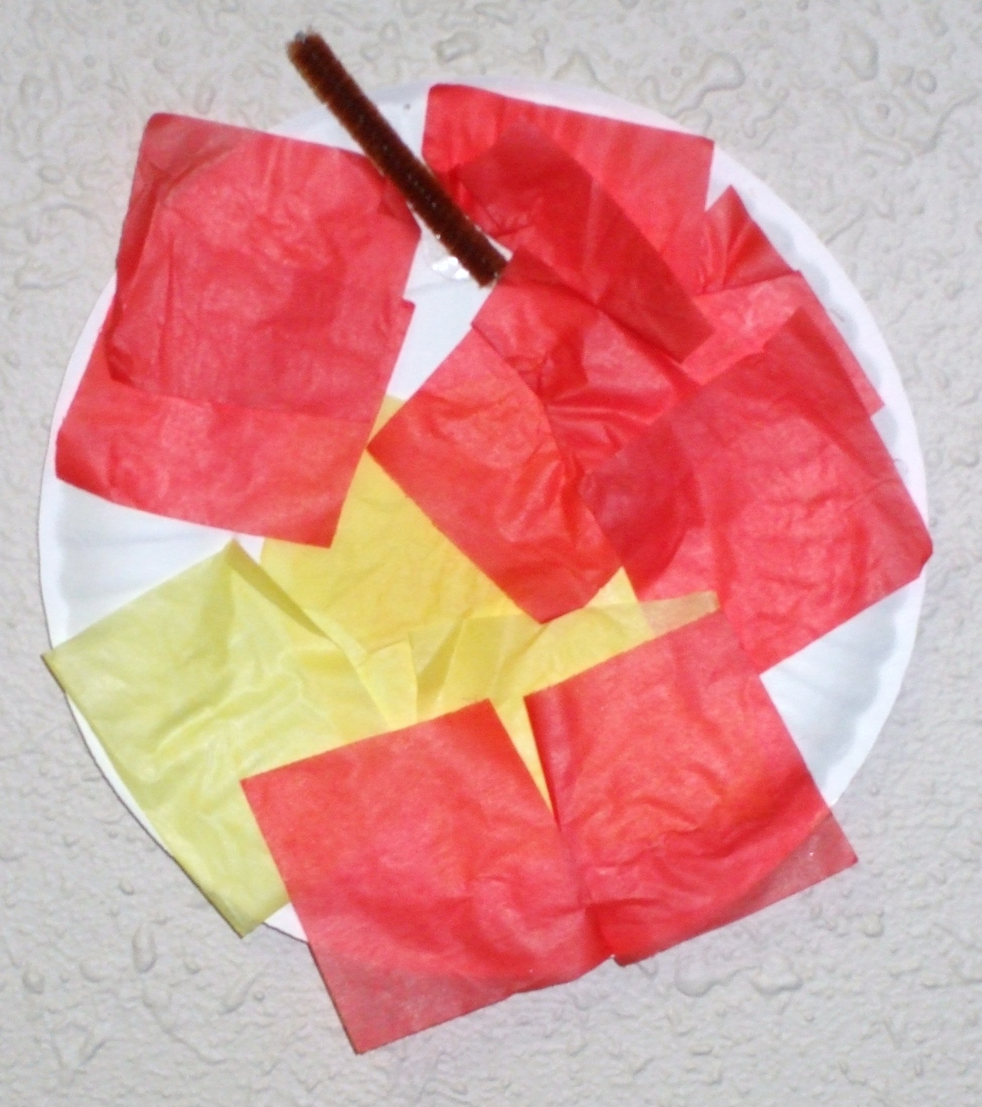 Directions: Either pre-cut, have kids cut or tear peices of tissue or paper. Glue to small paper plate.