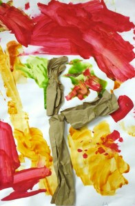 You will need: Large paper, brown paper or lunch bags (we recycled ours), tempra paint and white glue.