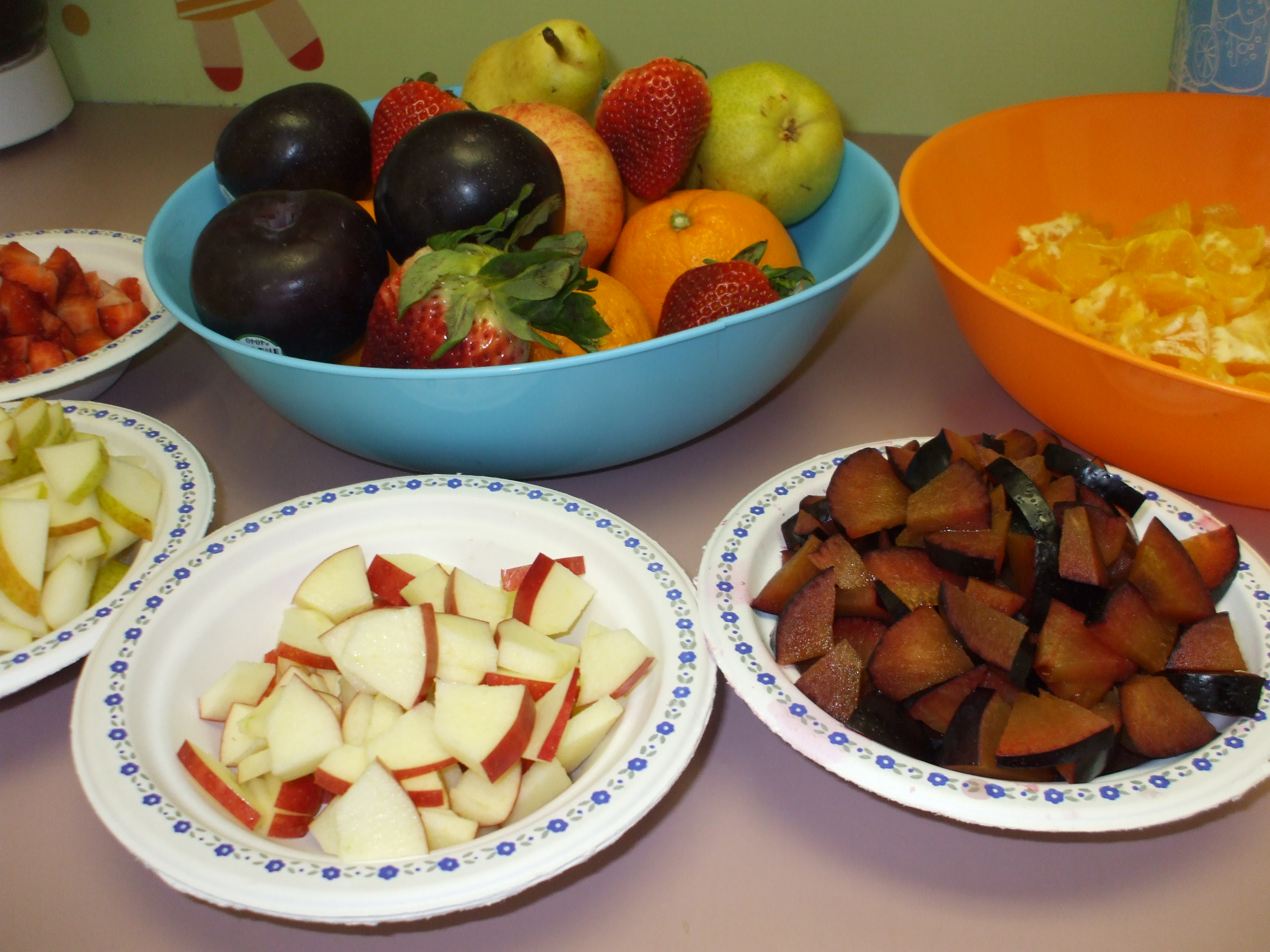 To the left: Laura is helping the children mix all the fruit together for our yummy salad