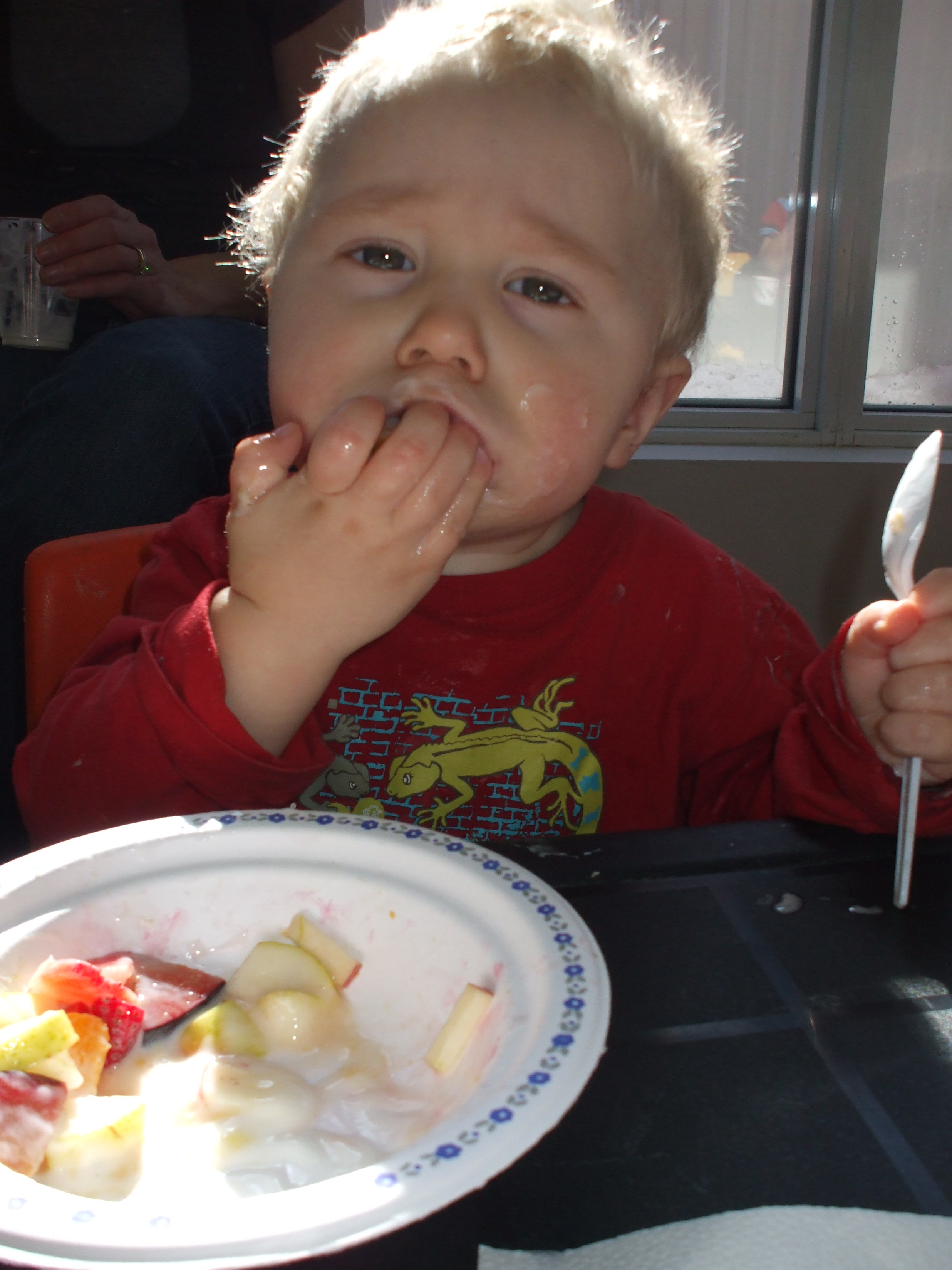 To the Right: Tayo is enjoying his yummy salad along with some yogurt.