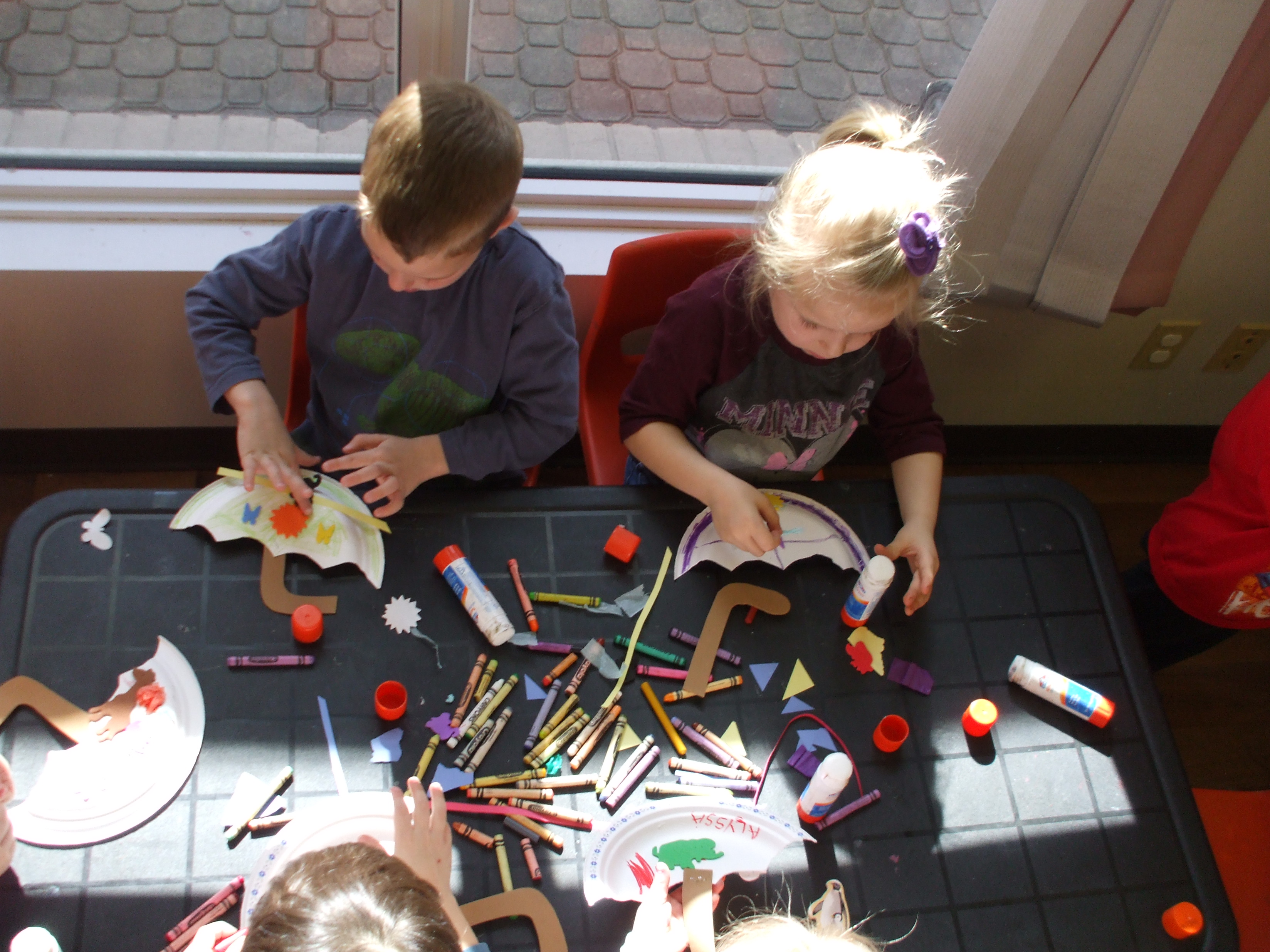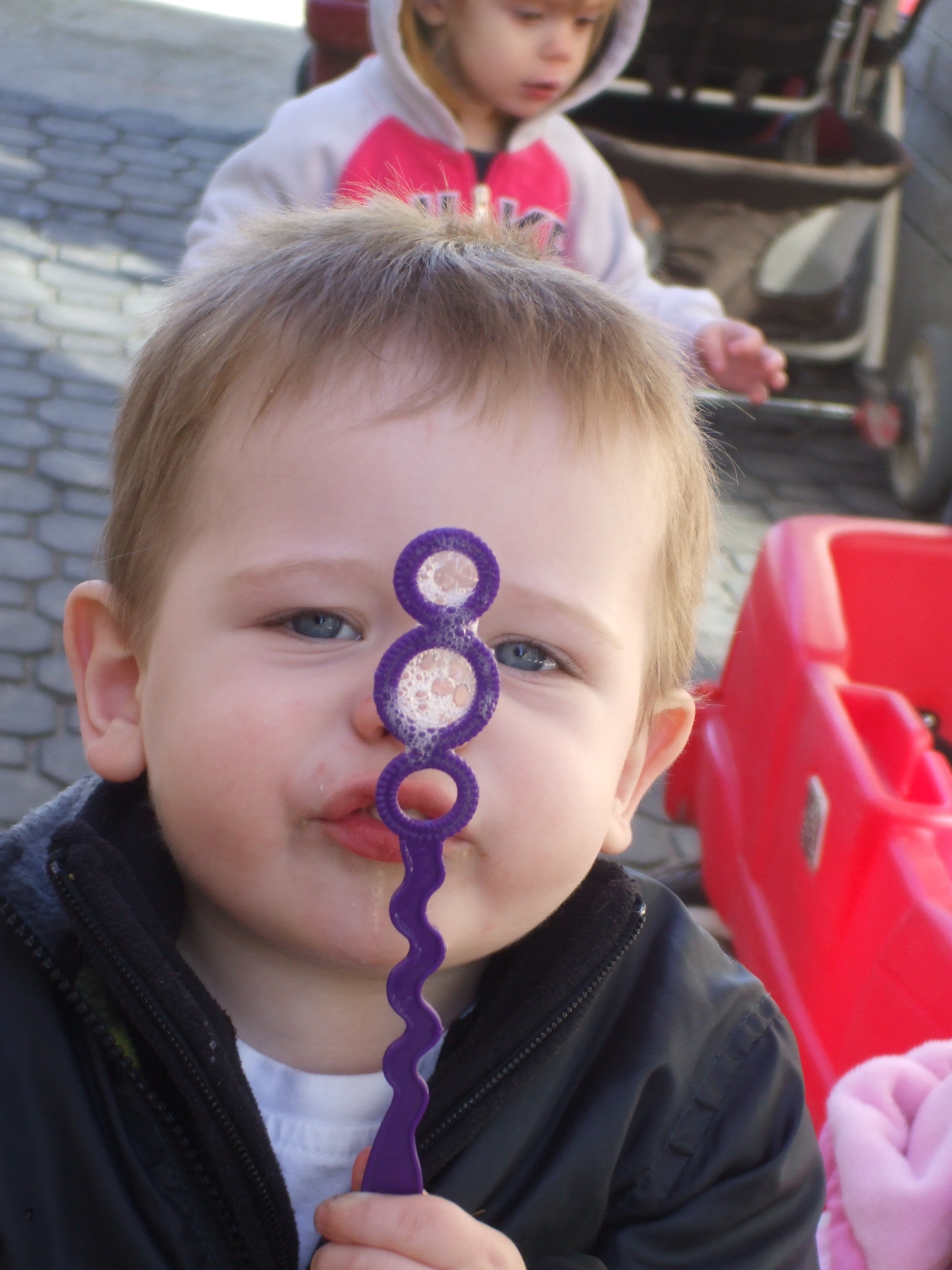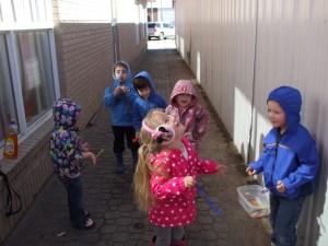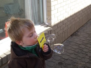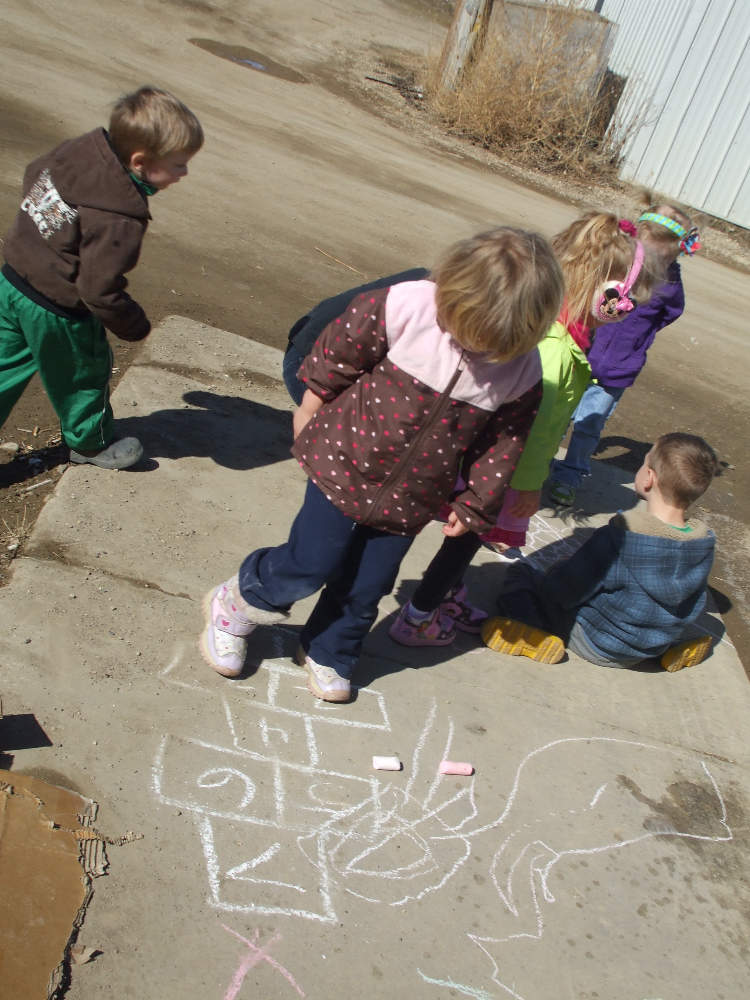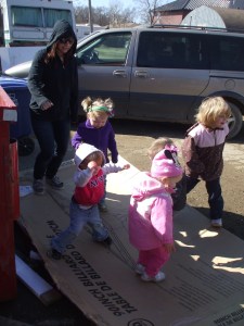 We started Spring off with a super easy craft thats is even easy for your smallest artist. All you need is a paper plate cut in half and give them some stickers, paint, tissue paper, markers, crayons, really anything to let them do their very own thing. We added a handle space cut out of foam. Easy and Simple :). It was just to nice this day and we could not pass up the chance to take the kids outside to blow bubbles, color the sidewalks with chalk and yes even a little box dancing for the toddlers. Yes I said box dancing. There was an old torn down dox the little ones decided was their very own stage to dance on.