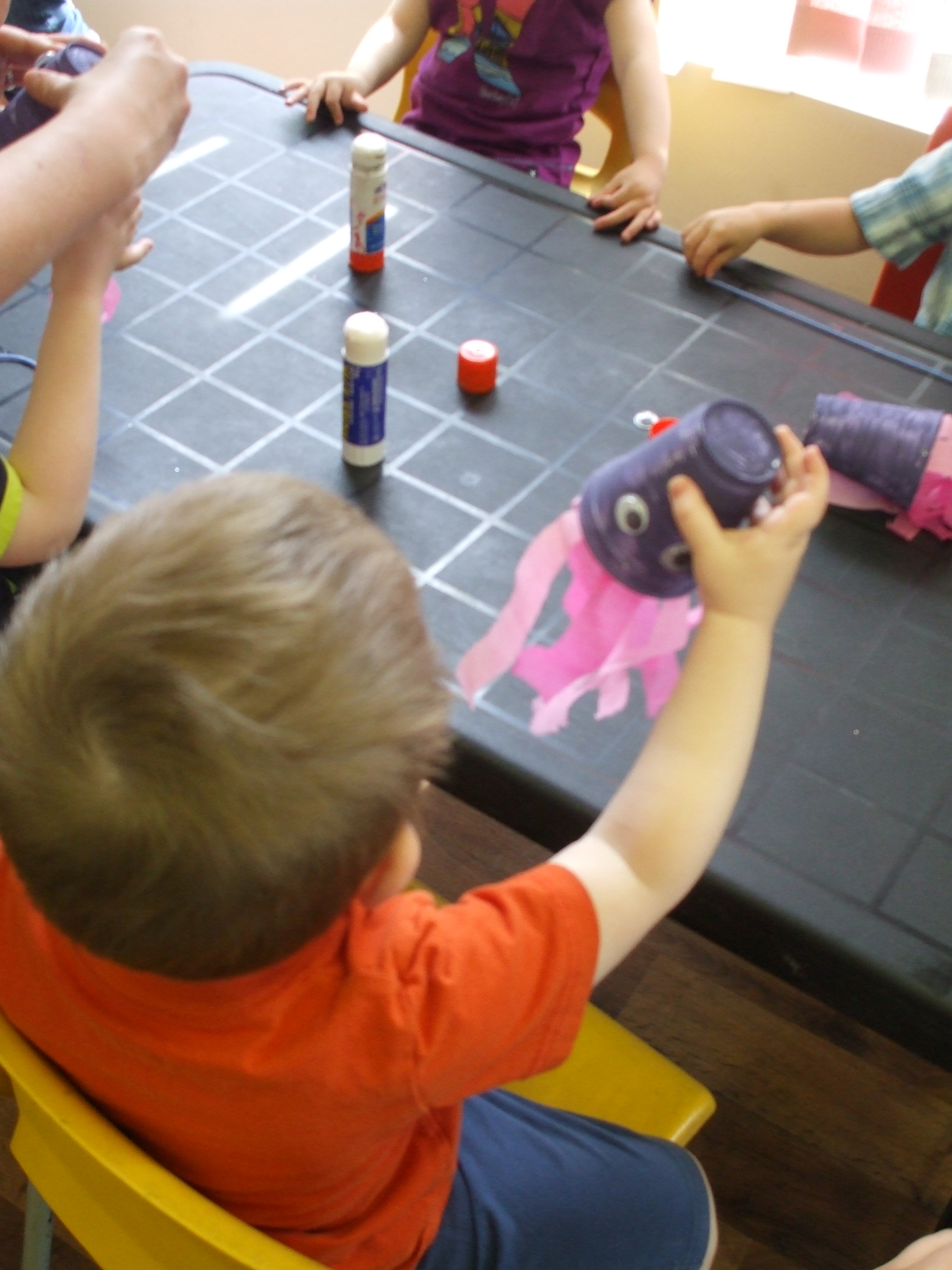 A simple craft to do with your child! Paint a Styrofoam cup with a blue/purple paint. Let it dry. Glue pieces of streamer into the open end of the cup. Cut a little hole into the bottom of the cup so you can knot a string through. Glue googly eyes on, or color your won! Hang to decorate the room!