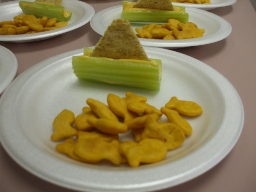 Our fun and creative moms made healthy snacks to go along with our theme! Goldfish crackers & “shark” celery. Or little crabs made from ritz crackers & cheese wiz or WOW butter (peanut butter replacement) and choi mein noodles for the little legs and raisins for the eyes.