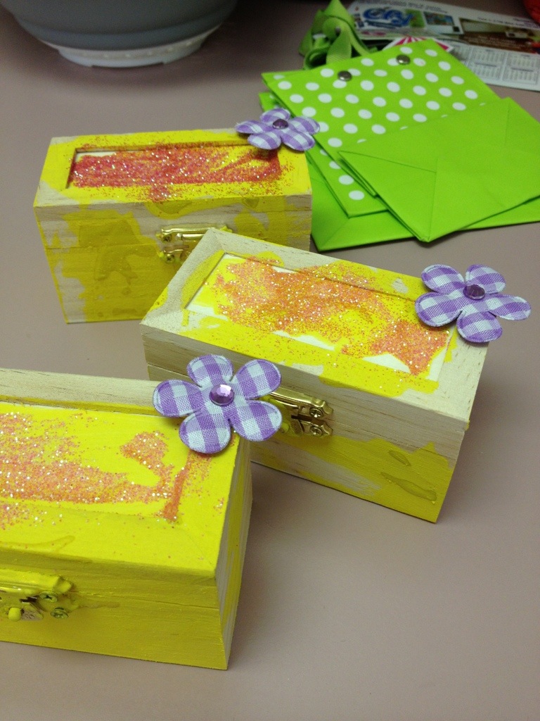 We painted small wooden boxes from Dollarama to make jewellery boxes and added some Hershey kisses as a special treat.