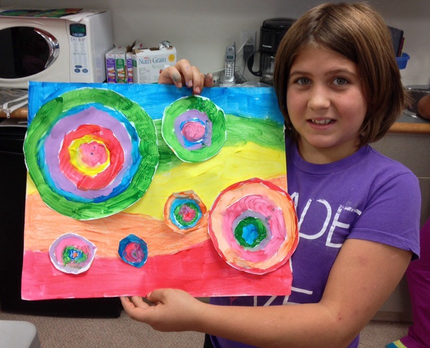 Our first R-tworx session of the season began with bold colors and interesting textures inspired by the art of Wassily Kandinsky. This artist is best known for his painting “Concentric Circles” which is the most reproduced abstract artworks in the world! Our students played with bold rainbow colours and texture plates to achieve a layered background. The circles were painted on separate paper, cut and assembled after their backgrounds had dried. The class had children from ages 6 -12 and each child was able to contribute a stunning and original piece. For a complete tutorial please visit: HERE