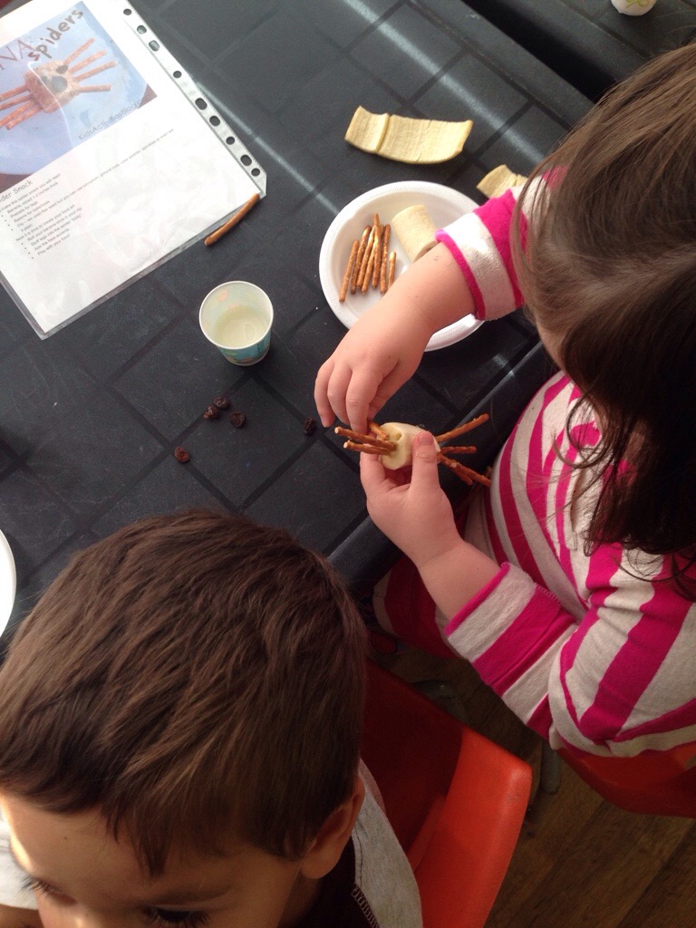 This week was our Eric Carle theme for the month and we did The Very Busy Spider. We read the story, made a couple of spider crafts and of course sang “The Itsy Bitsy Spider”. We even made our own snacks to look like spiders using a cut up banana, pretzels and raisins.