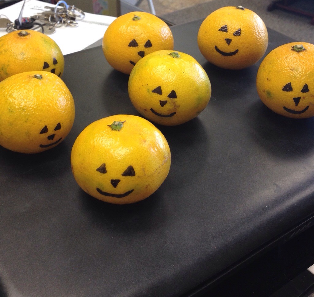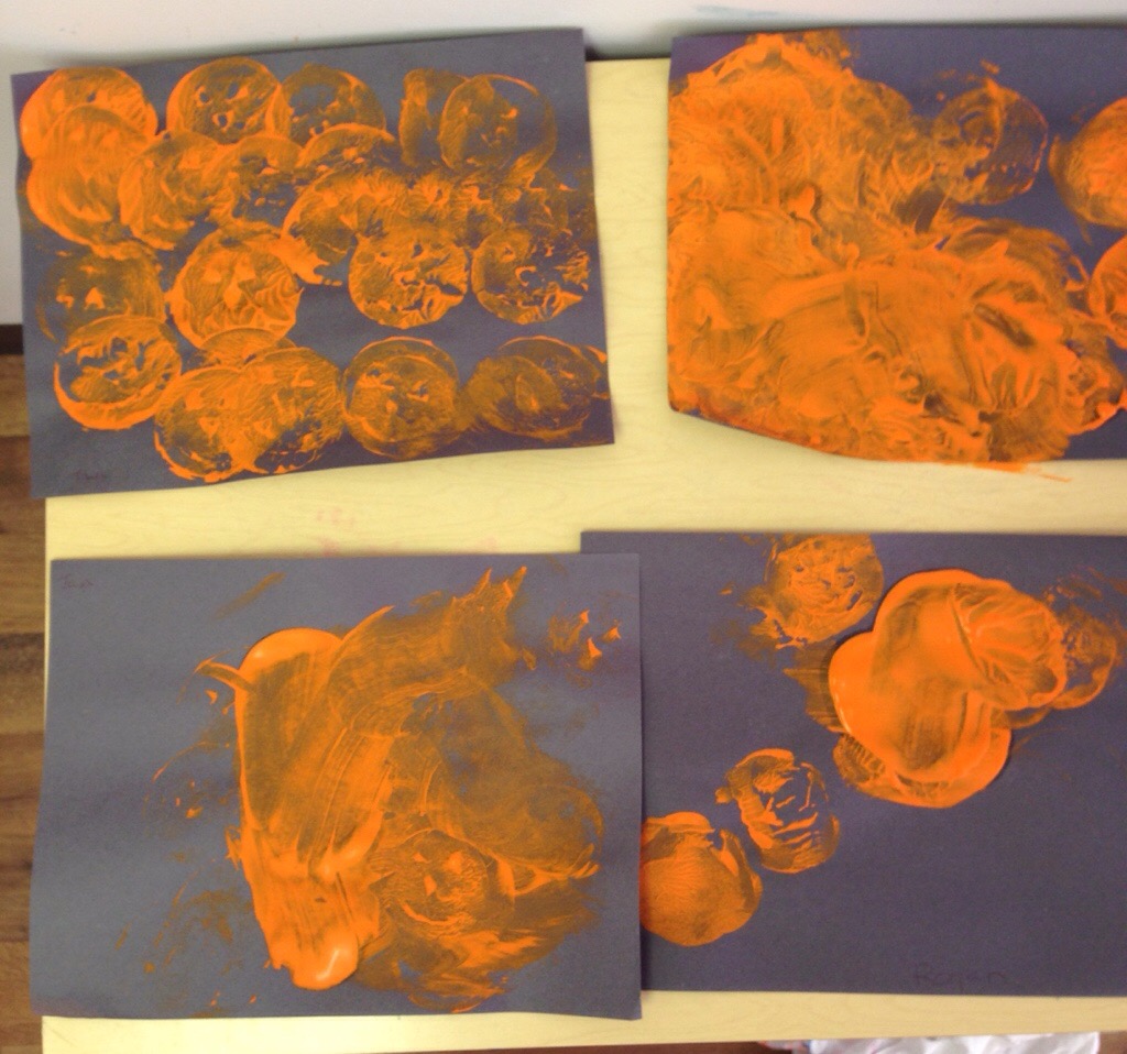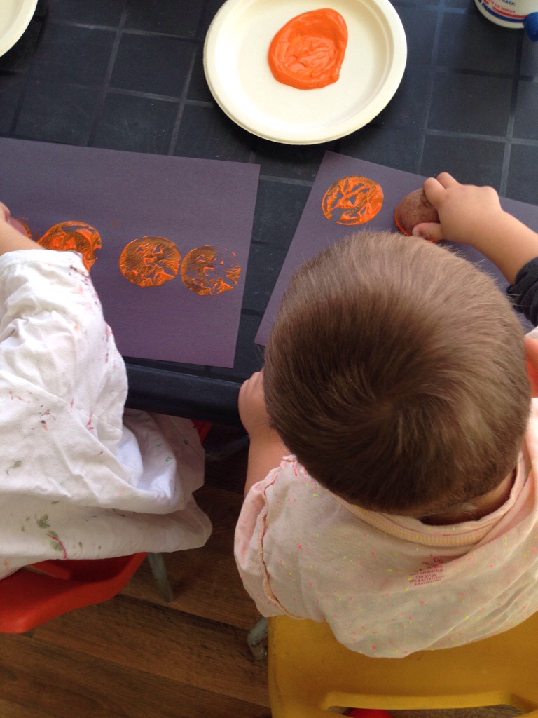 It’s hard to believe Halloween is just around the corner. This week we made our Halloween crafts. We made “spooky” ghosts and did some potato stamping in the shape of Jack-o-lanterns. For snack we had what the kids called “Halloween oranges”.