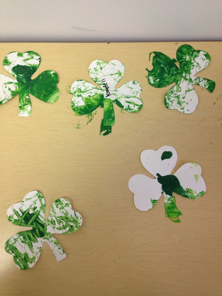 Happy St. Patrick’s Day at the playroom! We did 2 fun crafts that we’re all about the green and snack was all about rainbows. We also learned a fun new song about a leprechaun. The sneaky leprechaun left us a surprise in the office and we had lots of fun watching the “magic”. (Baking soda paste made into rocks with coins hidden inside. We added them to vinegar to uncover the treasure. Fun idea found on Pinterest)